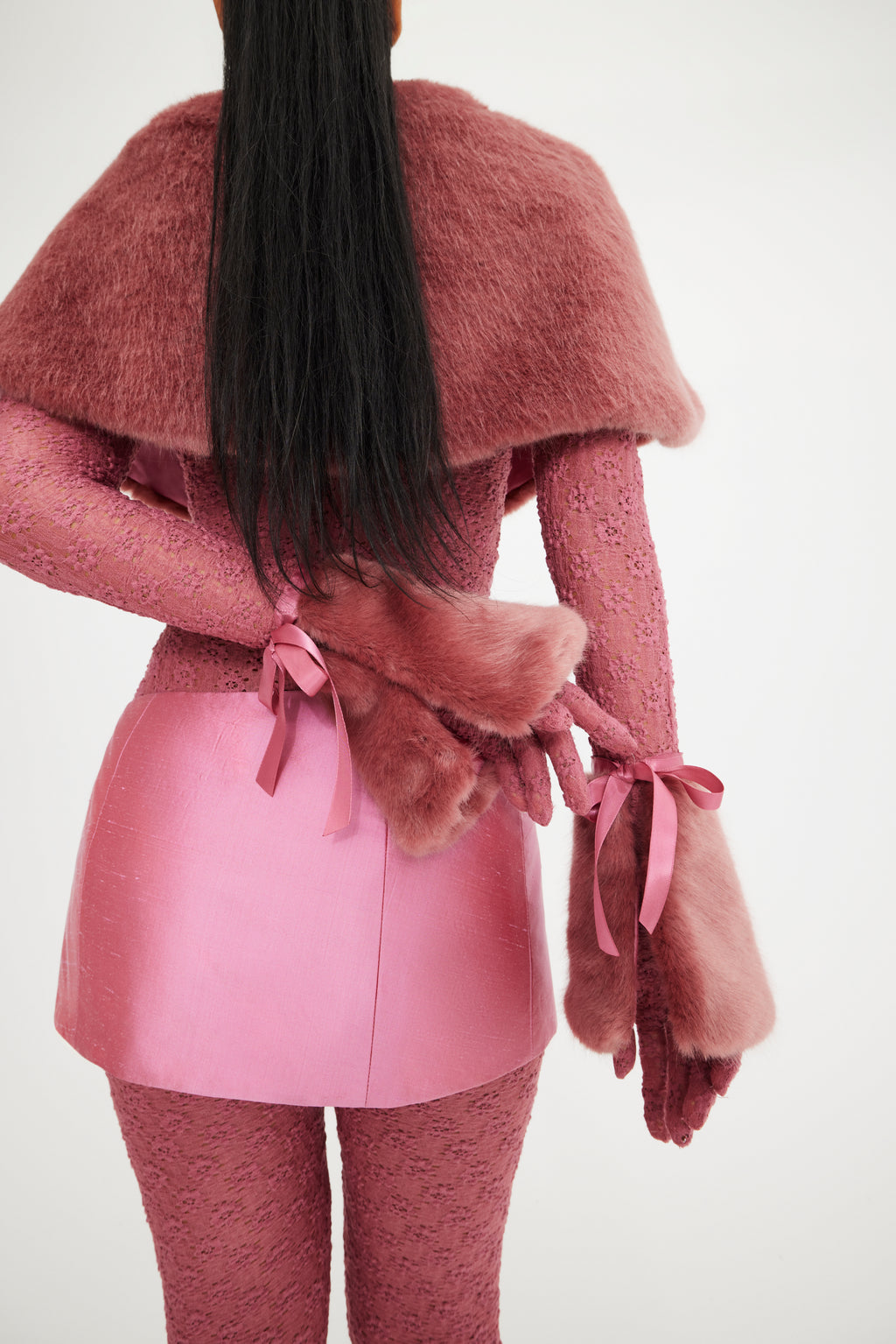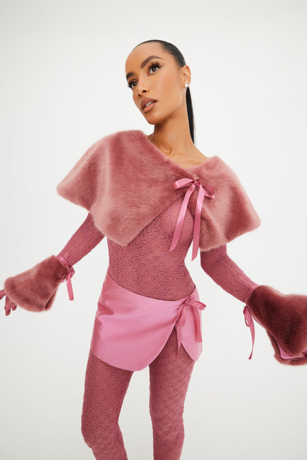 Unlined Raspberry mousse gloved sleeve popcorn textured lace catsuit. With open neck and ribbon closure system and keyhole at back.
