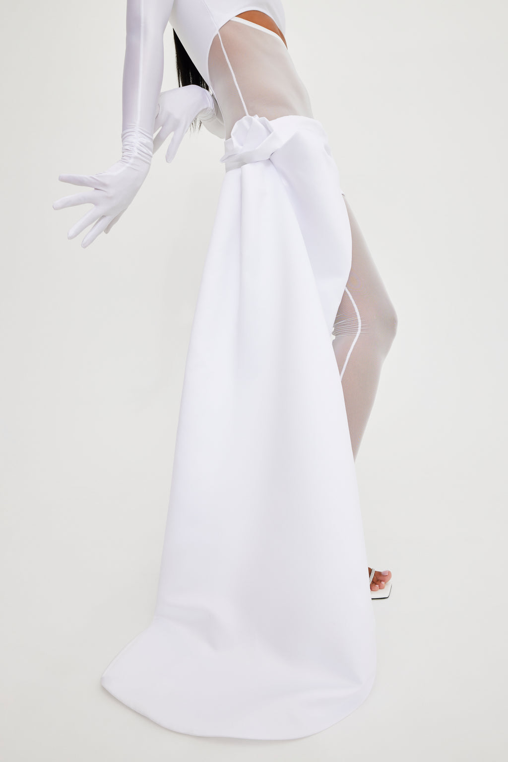 White sleeveless catsuit with shoulder straps and lycra 2-way stretch bust and with open tummy detail. Back lycra stripe line detailing at center back legs. Opening at heel and toes and center back invisible zipper.