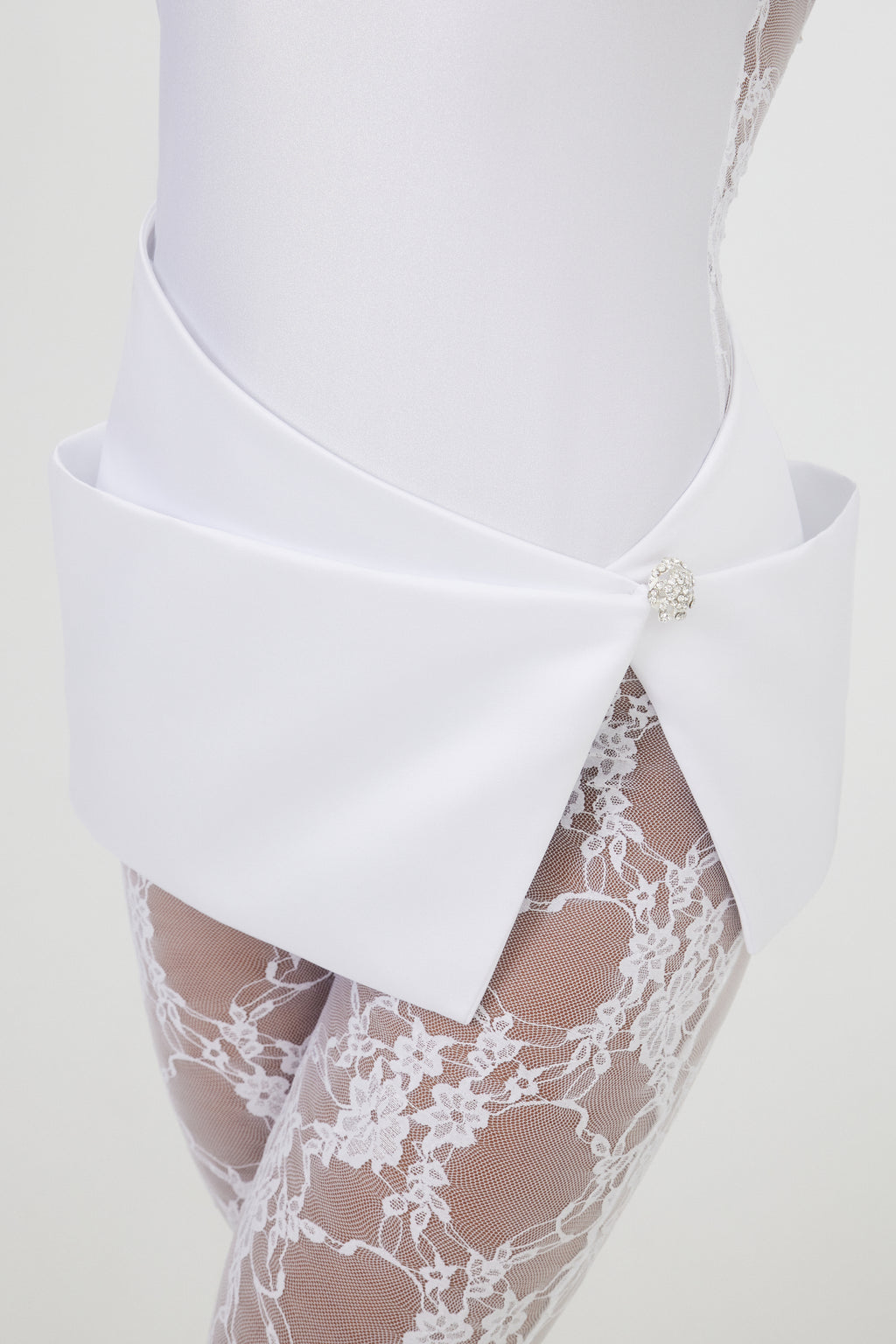 Shiny white off-the shoulder spandex gloved top with a full lace back. Openings to have access to using your bare hands.