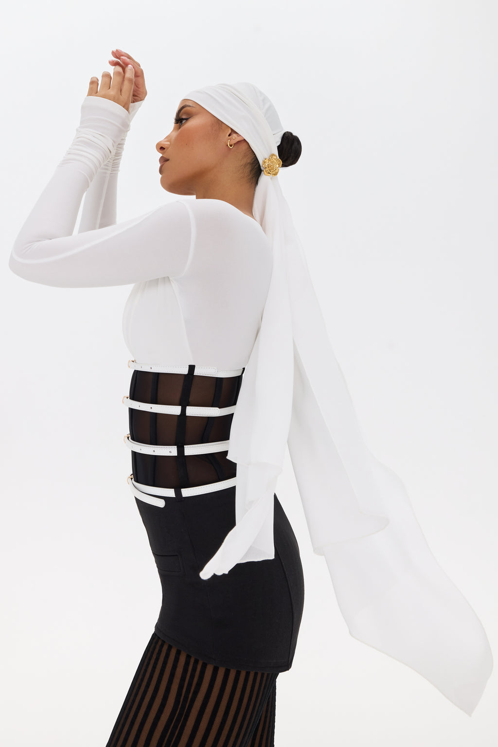 Designed for a sleek, elongating effect, the Monte Carlo Nights Legging-Shorts feature a high-waisted black crepe jersey short, seamlessly attached to sheer striped leggings. A built-in white genuine leather belt cinches the waist for a structured fit, while decorative front pockets and princess seams enhance the tailored silhouette. This statement layering piece brings effortless South of France-inspired styling with a modern edge—perfect for moonlit nights along the Riviera or a glamorous evening aboard a yacht.