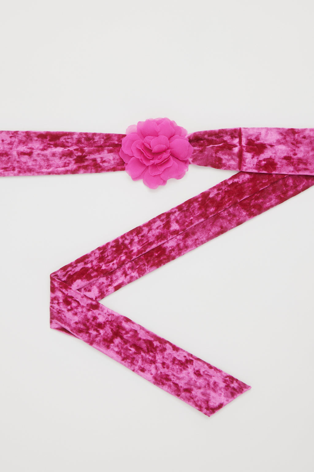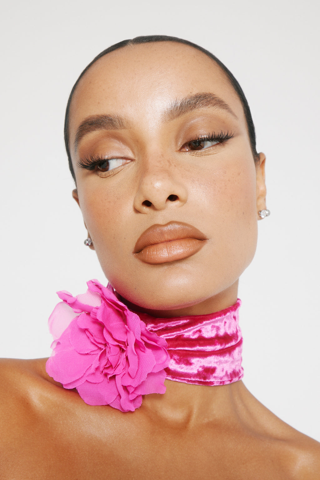 Fuchsia pink crushed velvet knit over the shoulder styled jumpsuit. Collar ban with side gather detailing at the shoulder. Featuring our signature gloved sleeves with cuff crystal shank button openings at the wrist. Invisible zipper at the center back.